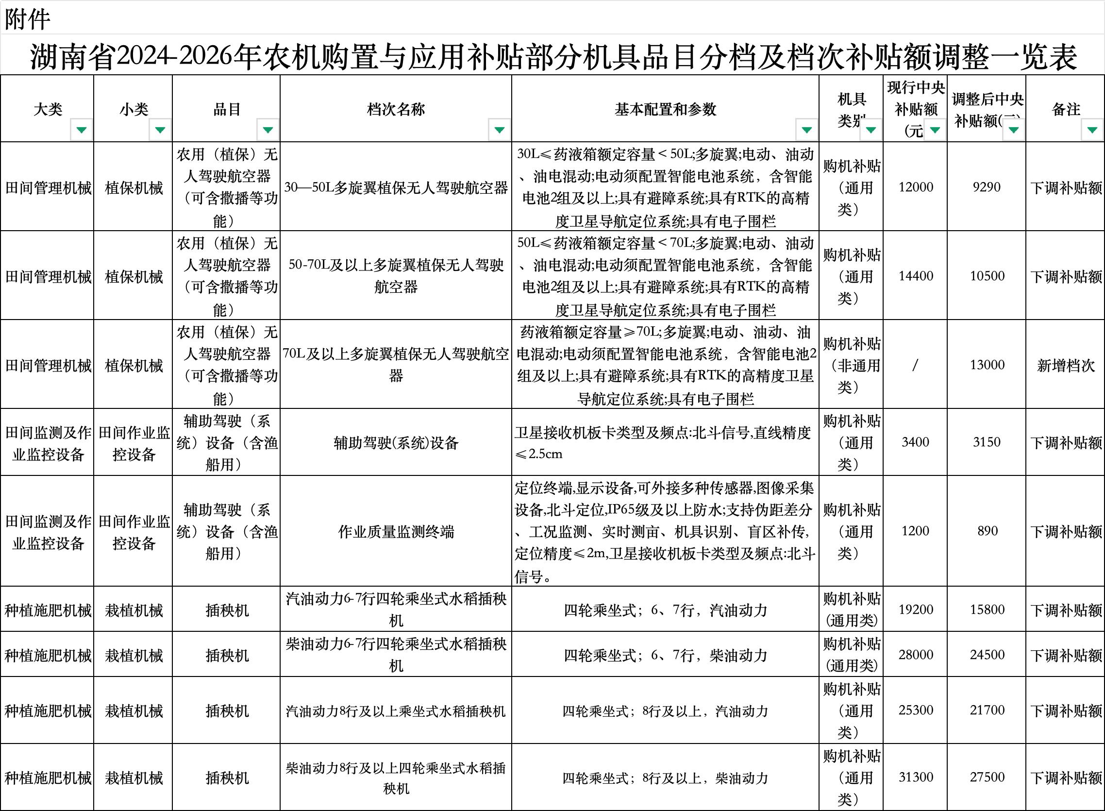 附件:湖南省2024-2026年农机购置与应用补贴部分机具品目分档及档次补贴额调整一览表(公示稿)